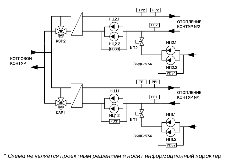 - управление подпиткой контуров с помощью подпиточных насосов и клапаном подпитки;